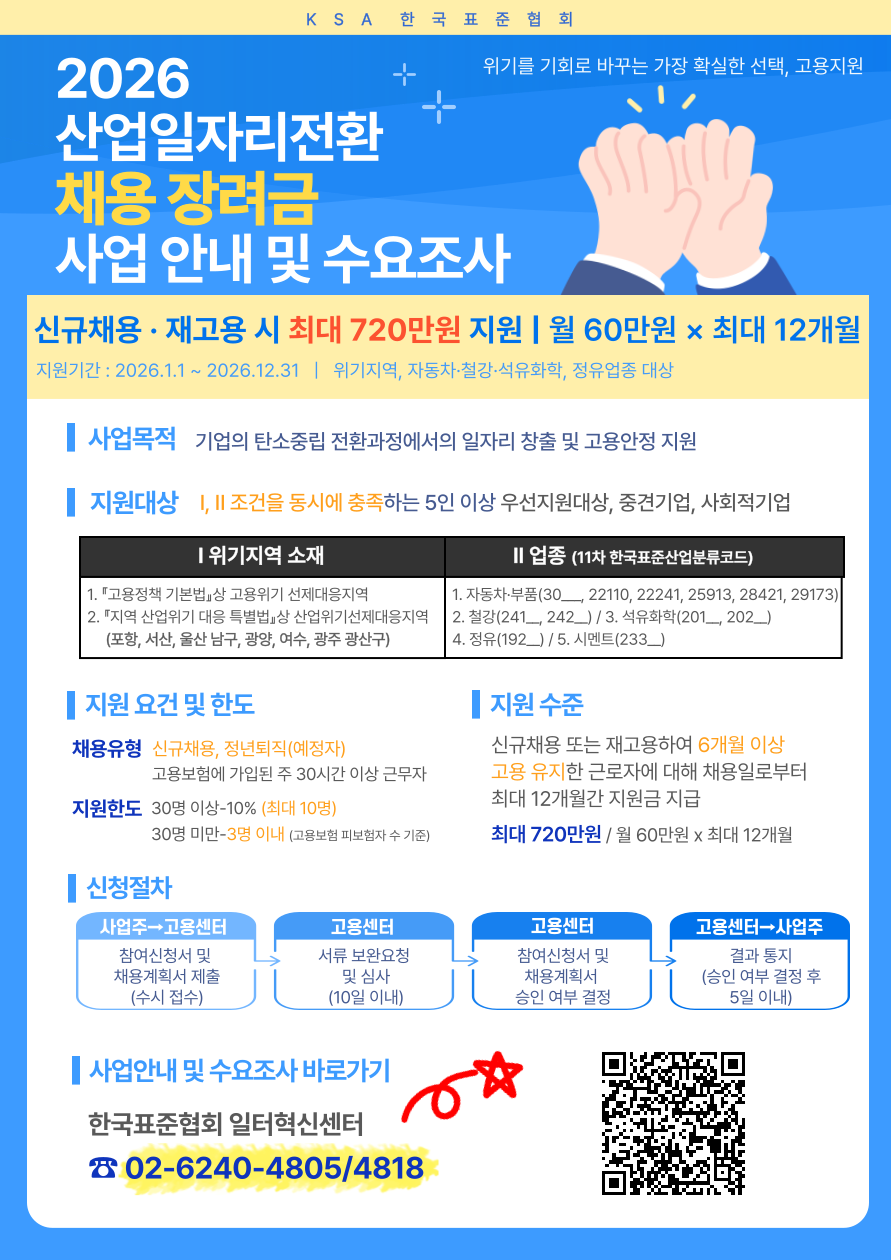 한국표준협회(KSA)에서 고용노동부의 2026 산업일자리전환 채용 장려금 사업을 안내드립니다.